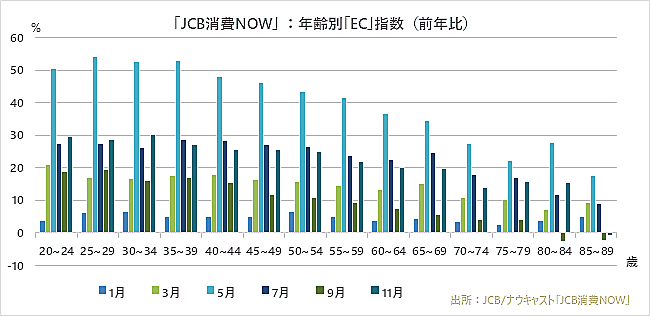 ECの伸びは年齢層が低いほど目立っている。「EC」は全年齢層で伸びており、年齢層が低いほど伸びが顕著となる傾向。ほとんどの年齢層で5月に最大の伸び率を記録している。