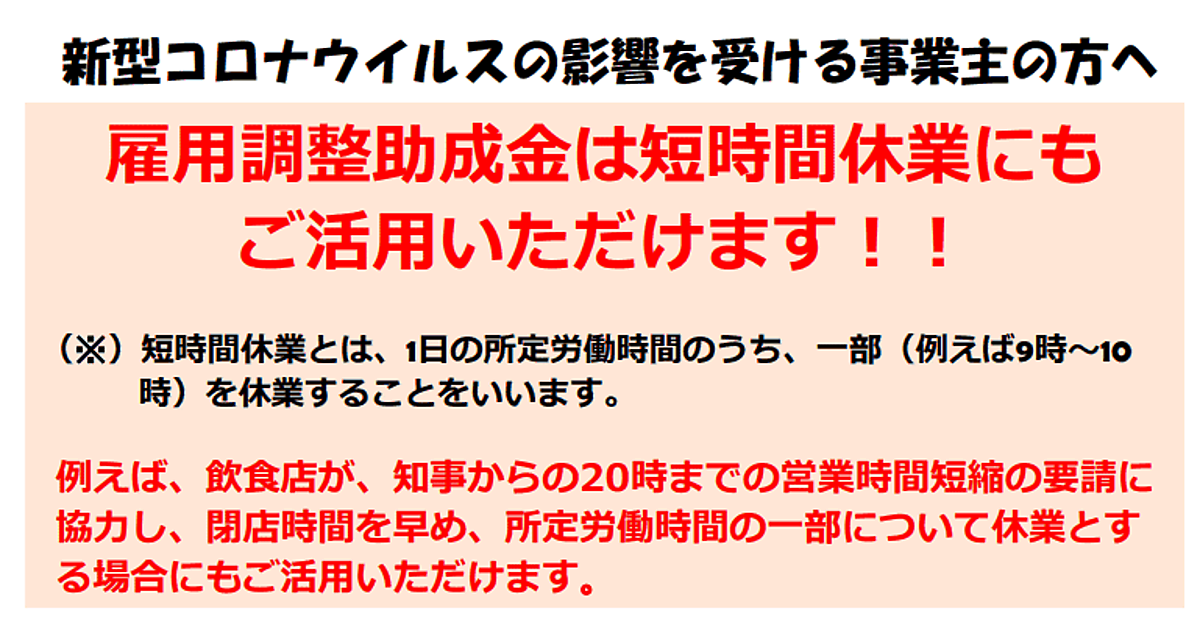 新型コロナウイルスの感染拡大の影響で売り上げが減少した事業者が休業手当を支給して従業員を休ませた場合、政府がその費用の一部を助成する「雇用調整助成金」(特例措置)について厚生労働省は、短時間休業にも活用できる旨のリーフレットを公表した。