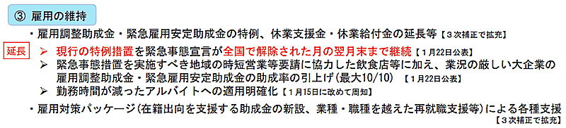 新型コロナウイルス感染症対策本部(第54回)では、「緊急事態措置を実施する必要がなくなったと認められるときは、法第32条第5項の規定に基づき、速やかに緊急事態を解除することとする」としており、2月中に全国で緊急事態宣言が解除されれば、「雇用調整助成金」(特例措置)などの現行措置は3月末までとなる。