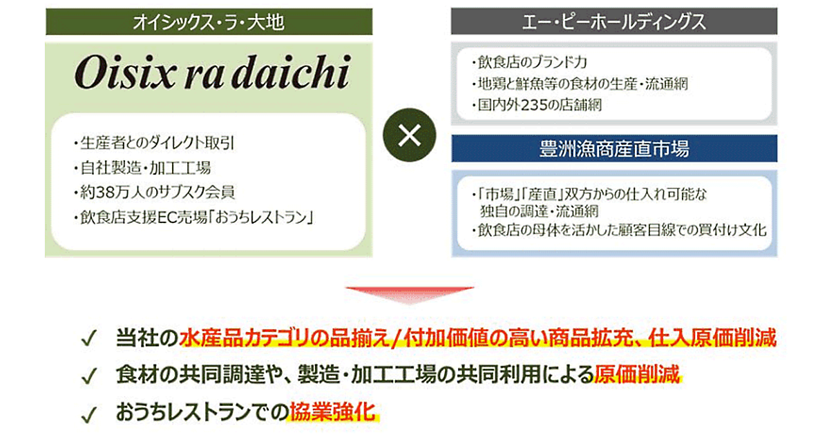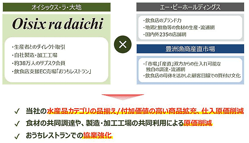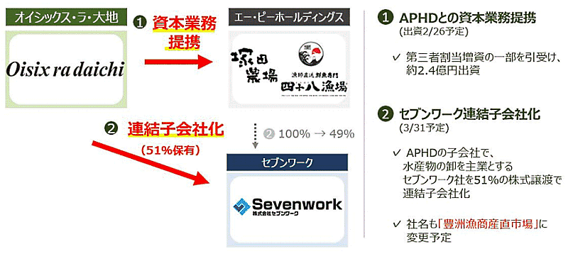 さらに3月31日付でAPHD傘下で水産卸を手がけるセブンワーク(SW)の株式51%を取得し、連結子会社化。オイラ大地は水産物カテゴリの宅配を強化する。連結子会社化と同時にSWの社名を「豊洲漁商産直市場」へ変更する予定。