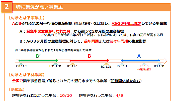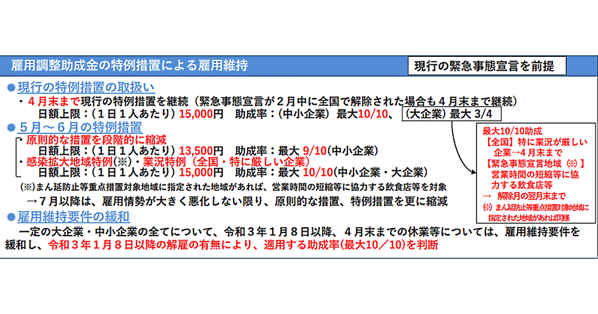 現行の特例措置は、2020年1月24日以降の解雇などの有無で確認しているが、2021年1月8日以降、4月末までの休業などについては、2021年1月8日以降の解雇の有無で適用する助成率を判断する。