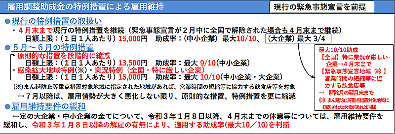 業況が厳しい大企業、および緊急事態宣言対象地域で知事の要請を受けて営業時間の短縮へ協力する大手飲食店などへの助成率を最大10/10とする取り組みも4月末まで継続する。