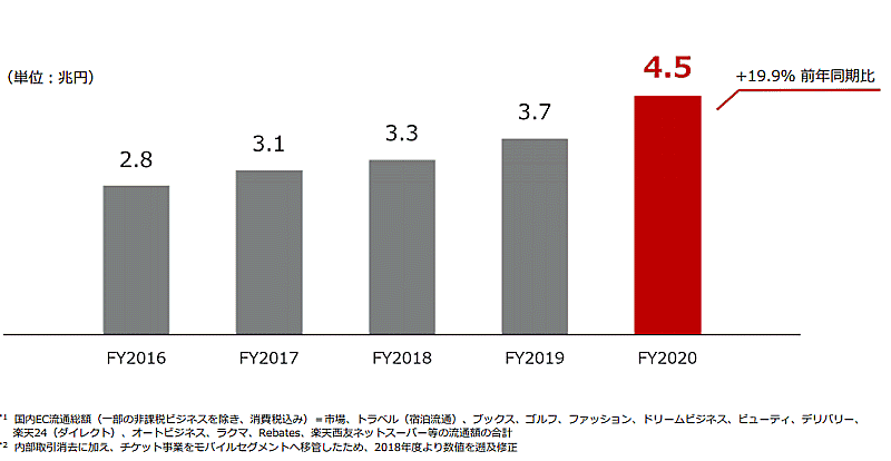 楽天の2020年度(2020年1~12月期)国内EC流通総額は前期比19.9%増の4兆4510億円だった。「楽天市場」を中心に2020年度における国内ECの状況をまとめた。