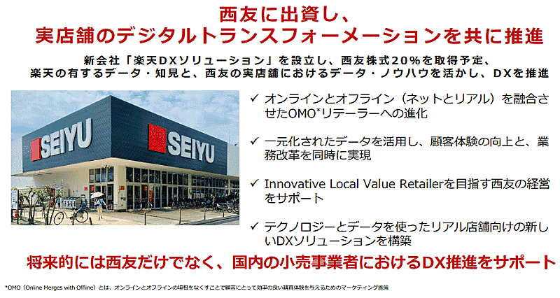 ウォルマートが保有する西友の株式について、米国の資産運用会社であるKKRが65%、楽天が新たに設立する子会社「楽天DXソリューション(仮)」を通じて20%を取得することで合意、契約を提携。実店舗のDXを推進していくという。