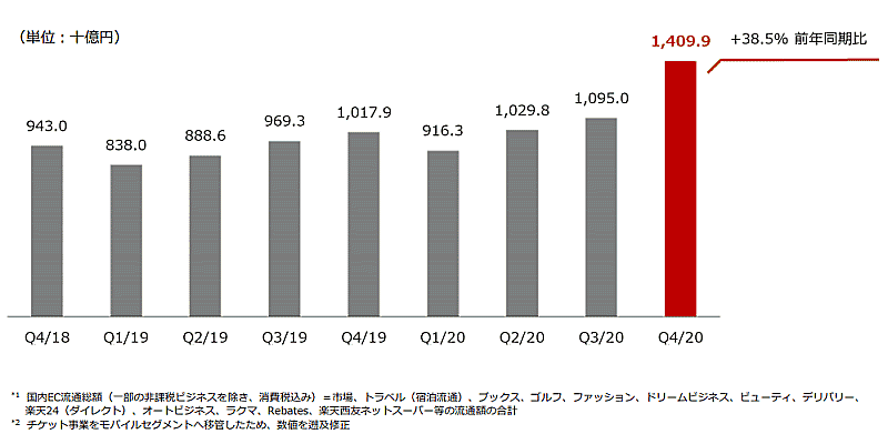 なお、1月28日にオンライン配信で行われた「新春カンファレンス」で楽天の三木谷浩史会長兼社長は、2020年12月期に「楽天市場」単体で流通総額が3兆円を突破したことを表明している。
