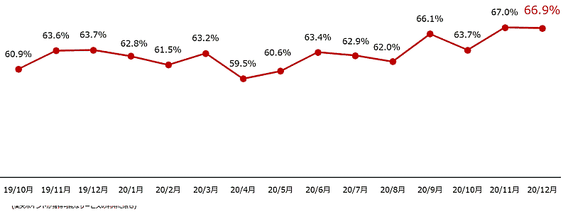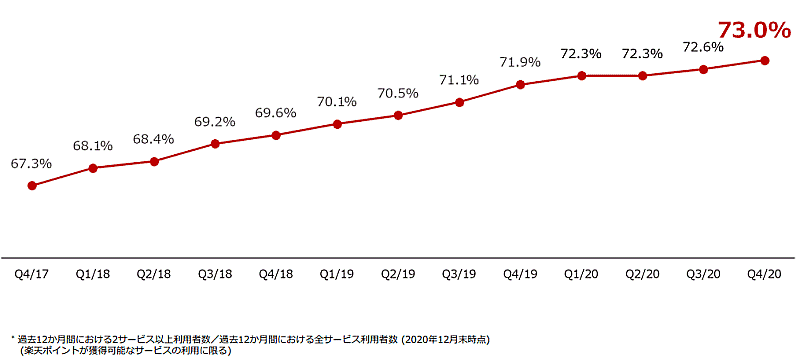 過去12か月間で2サービス以上利用者数を同期間の全サービス利用者数(2020年12月末時点)で割って算出したクロスユース率は、2020年12月末時点で73.0%となった。前年同期比で1.1ポイント増。