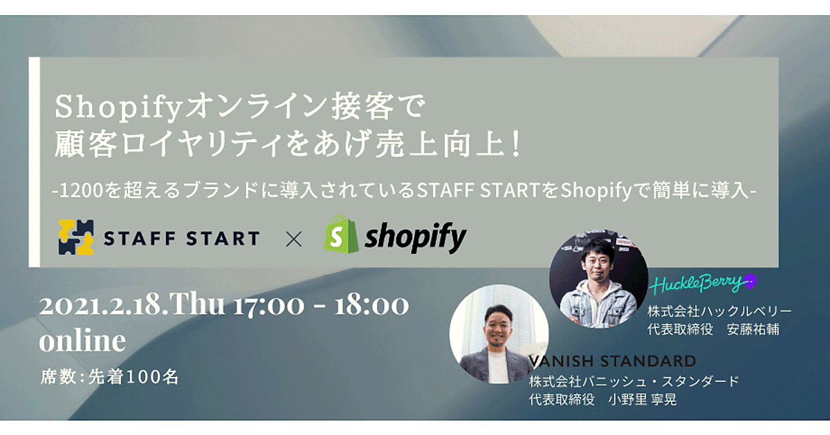 「Shopify」向けアプリの開発などのハックルベリーは、「Shopifyオンライン接客で顧客ロイヤリティをあげ売上向上!-1200を超えるブランドに導入されているSTAFF STARTをShopifyで簡単に導入」と題した無料ウェビナーを2月18日に開催する。