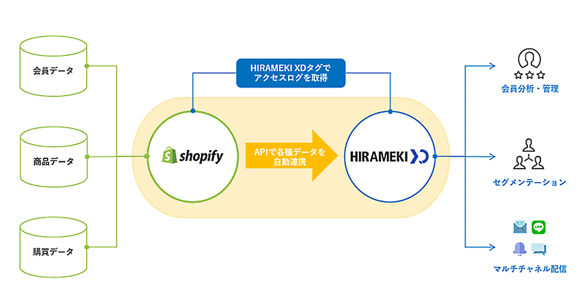 「Shopify」で運営しているECサイトが「HIRAMEKI XD」を活用するためには、会員情報や商品マスターのインポートといった編集・連携作業が必要で、マーケティングやCRM施策をスタートさせるための初期設定などに時間がかかってしまうという課題があった。