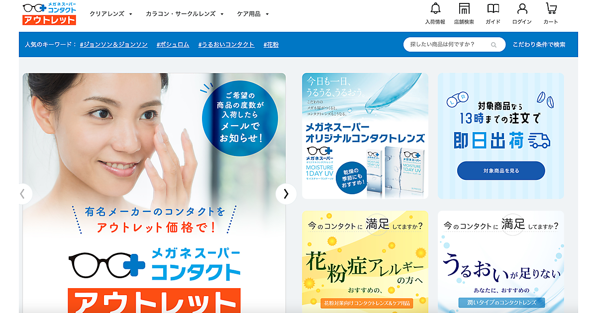 ビジョナリーホールディングスが3月1日に開設した「メガネスーパーコンタクト アウトレットサイト」では、グループ店舗で扱うクリアコンタクトレンズ、カラーコンタクトレンズ、コンタクトレンズケア用品など、使用期限までの期間が短い商品を特別価格で販売。