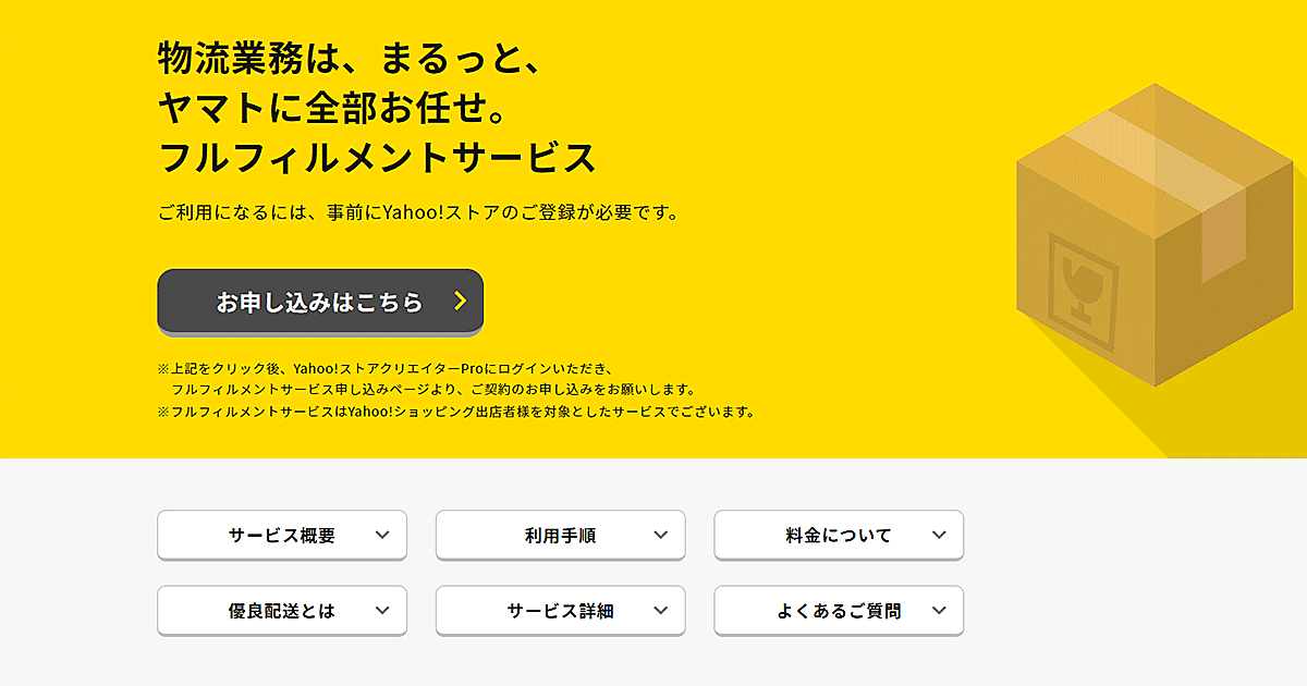 ヤマト運輸の物流拠点に出店ストアの商品を保管し、受注や梱包、在庫管理、発送などをヤマト運輸が代行するサービス。配送手数料と保管料が発生する。