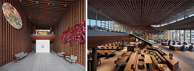 本社屋の執務スペースは、大きな窓が特徴の開放的なデザイン。オフィス内には、国内の若手アーティストなどによるアート作品を装飾、ファッションとも親和性が高いアート作品が社員にインスピレーションをもたらすことを期待しているという。