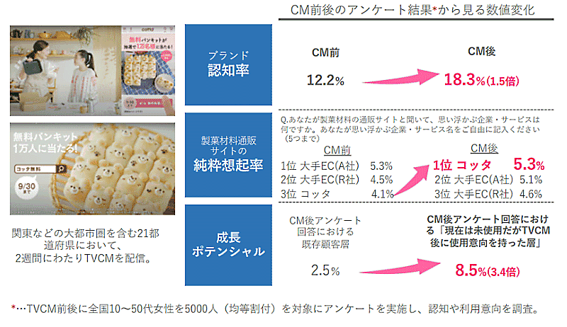 初のテレビCMは2020年1~2月、福岡県を対象にテストマーケティングの位置付けで実施。その後に行った消費者アンケート調査によると、テレビCMで「cotta」を認知して「使ってみたい」という顧客層は、既存顧客層の7.3倍に増加。テレビCM実施後の「cotta」の認知率は、放送前9.0%から25.9%に向上した。