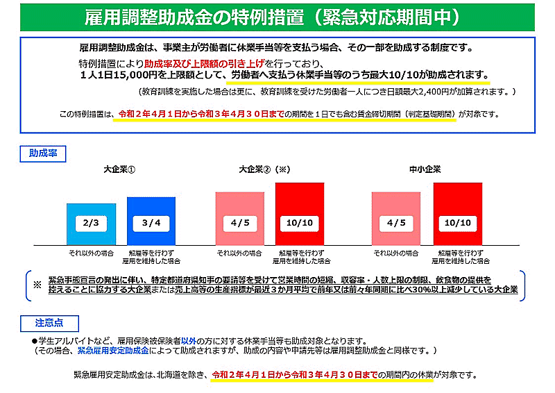 業況が厳しい大企業、および緊急事態宣言対象地域で知事の要請を受けて営業時間の短縮へ協力する大手飲食店などへの助成率を最大10/10とする取り組みも4月末までとなる。