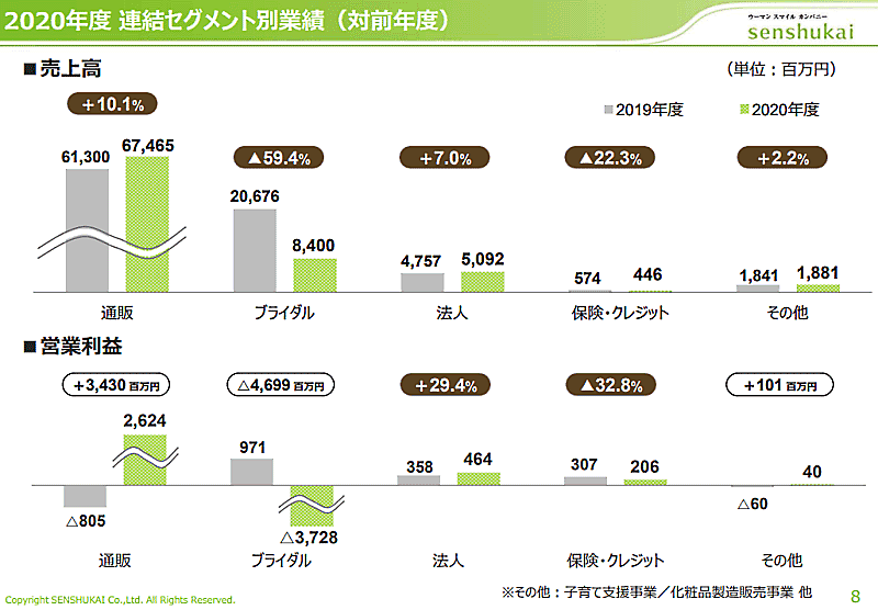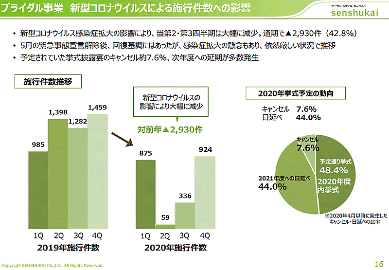 千趣会の2020年12月期におけるブライダル事業の業績は、売上高が前期比59.4%減の84億円、営業損失は37億2800万円(前期は9億7100万円の営業利益)だった。