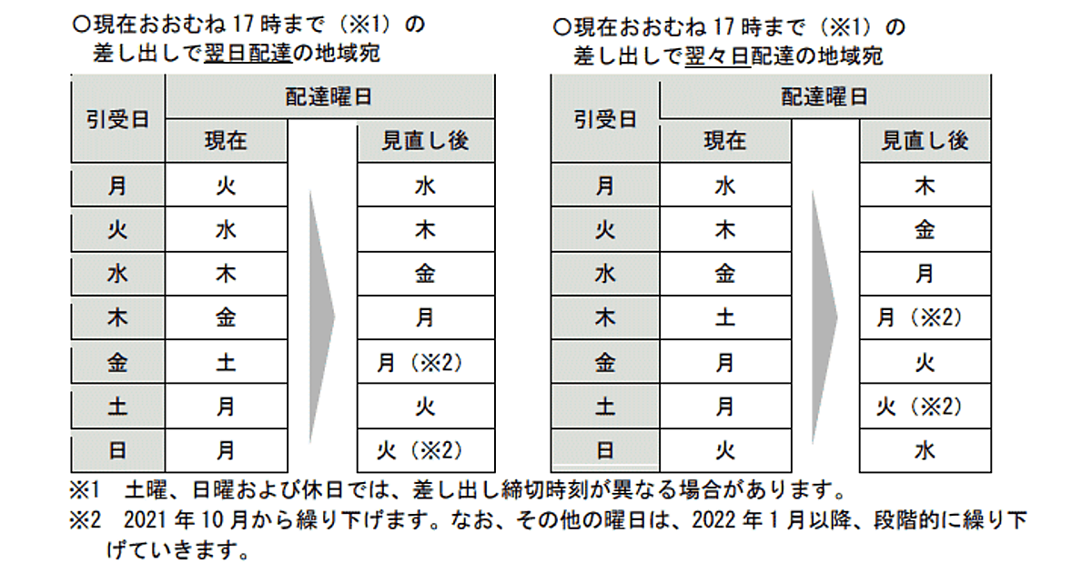 日本郵便は、2020年12月に公布された「郵便法及び民間事業者による信書の送達に関する法律の一部を改正する法律に基づき、関係法令が施行された場合に2021年10月以降、普通扱いとする郵便物と「ゆうメール」の土曜日配達を休止する。