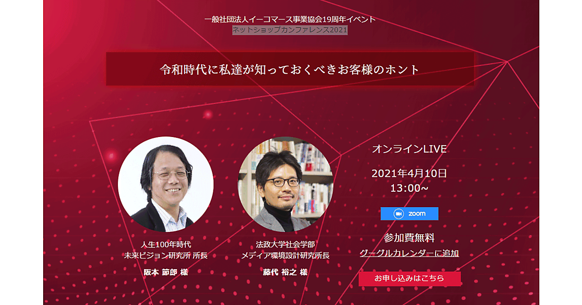 一般社団法人イーコマース事業協会は4月10日(土)、設立19周年の記念イベント「ネットショップカンファレンス2021」をオンラインLIVEで開催する。会員、非会員ともに参加費は無料。