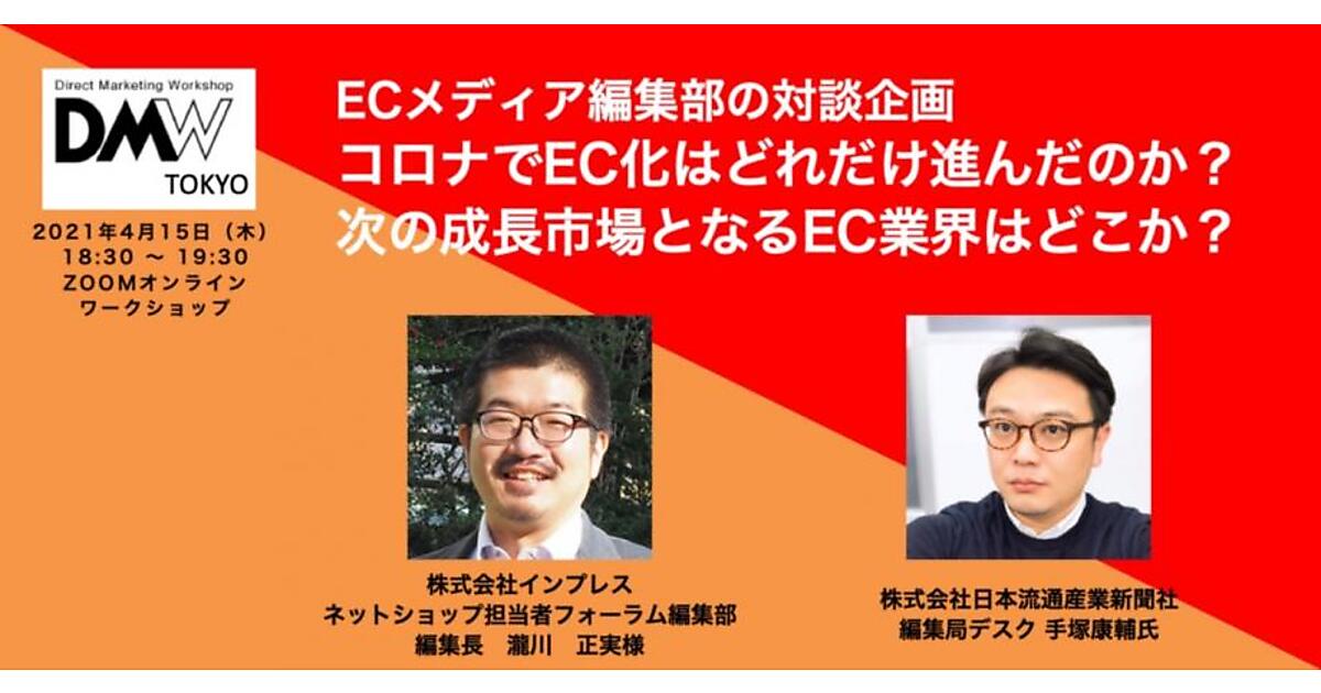 ダイレクトマーケティングワークショップ(DMW)東京支部は、「【ネットショップ担当者フォーラム x 日本ネット経済新聞】ECメディア編集部の対談企画コロナでEC化はどれだけ進んだのか? 次の成長市場となるEC業界はどこか?」と題した有料ウェビナーを、4月15日(木)に開催する。