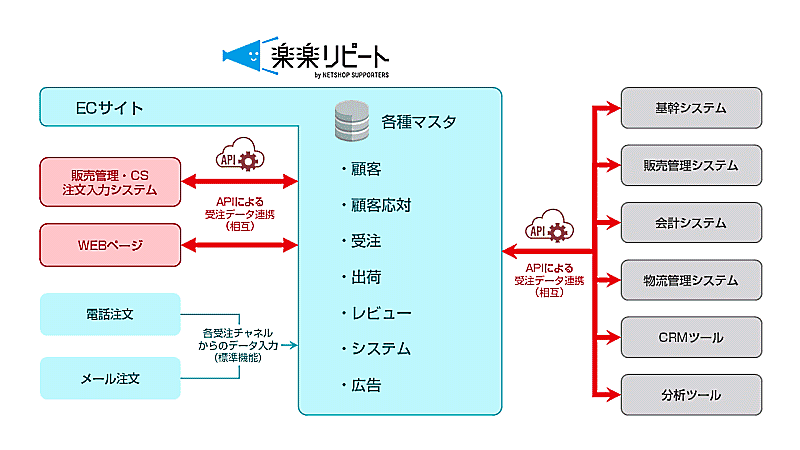 「楽楽リピート」では2020年、受注・顧客関連情報が取得できるAPI機能「楽楽リピート API」の提供をスタートした。CRMシステム、基幹・販売管理システム、物流管理システムなどとのデータ連携をシームレスに行えるようにしている。