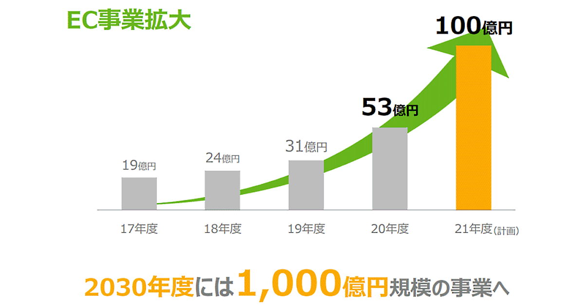 2021年2月期のEC売上高は前期比76.1%増の53億円。今期(2021年度)はEC売上高100億円をめざ計画だ。