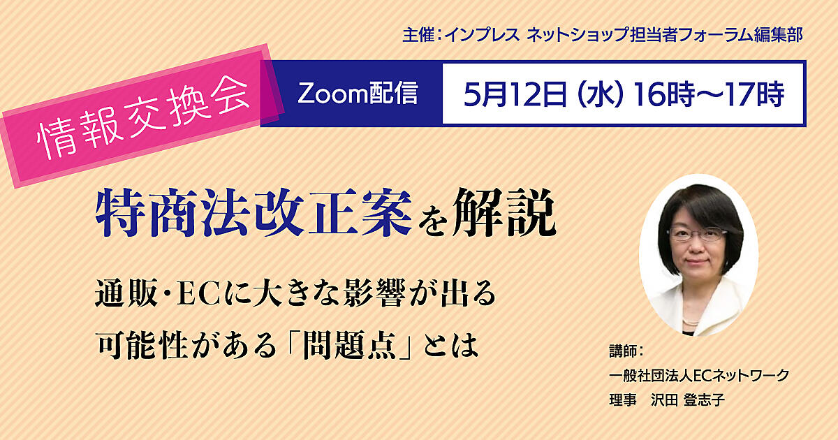 ウェビナー形式の情報交換会では、「特定商取引法及び預託法の制度の在り方に関する検討委員会」に臨時委員として参加した一般社団法人ECネットワーク沢田登志子氏が、改正案のうちECに関連する内容を解説、健全な通販・EC事業者に与える影響を最小化するためのアクションについて参加した皆さんと考える場にしたいと考えています。