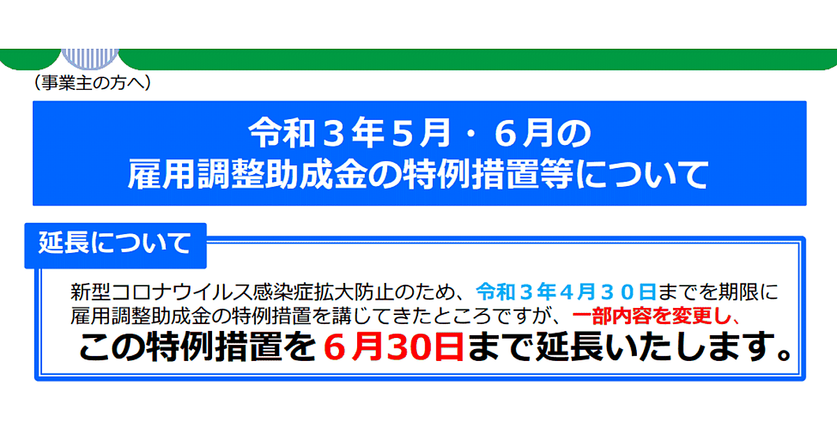 「まん延防止等重点措置」を適用した区域には「まん延防止等重点措置に係る雇用調整助成金の特例」を6月30日まで適用。対象区域では、大企業への助成率は4/5で解雇せず雇用を維持した場合は10/10、中小企業の助成率は4/5で解雇せず雇用を維持した場合は10/10、1人1日あたりの助成額の上限は1万5000円としている。