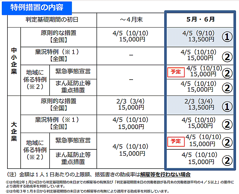 なお、上述した以外の地域や企業では原則として特例措置は縮減する。1人1日あたりの助成額1万5000円の上限を、5~6月の2か月間の措置として1万3500円まで減らす。助成率は9/10に縮減する。
