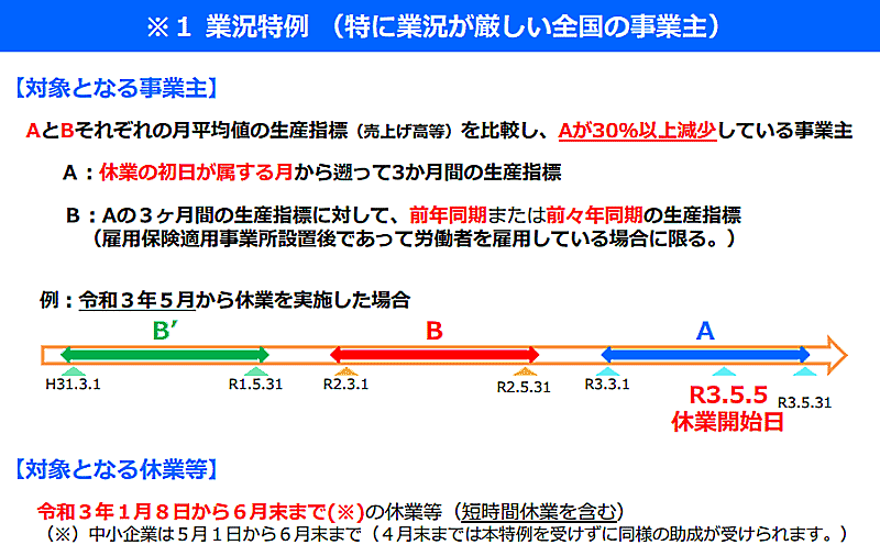 感染が拡大している地域(まん延防止等重点措置対象地域の知事による基本的対処方針に沿った要請)、生産指標(売り上げなど)が直近3か月の月平均と前年または前々年の同期と比べ3割以上減少した全国の事業所については、「雇用調整助成金」の特例(業況特例)を設けている。