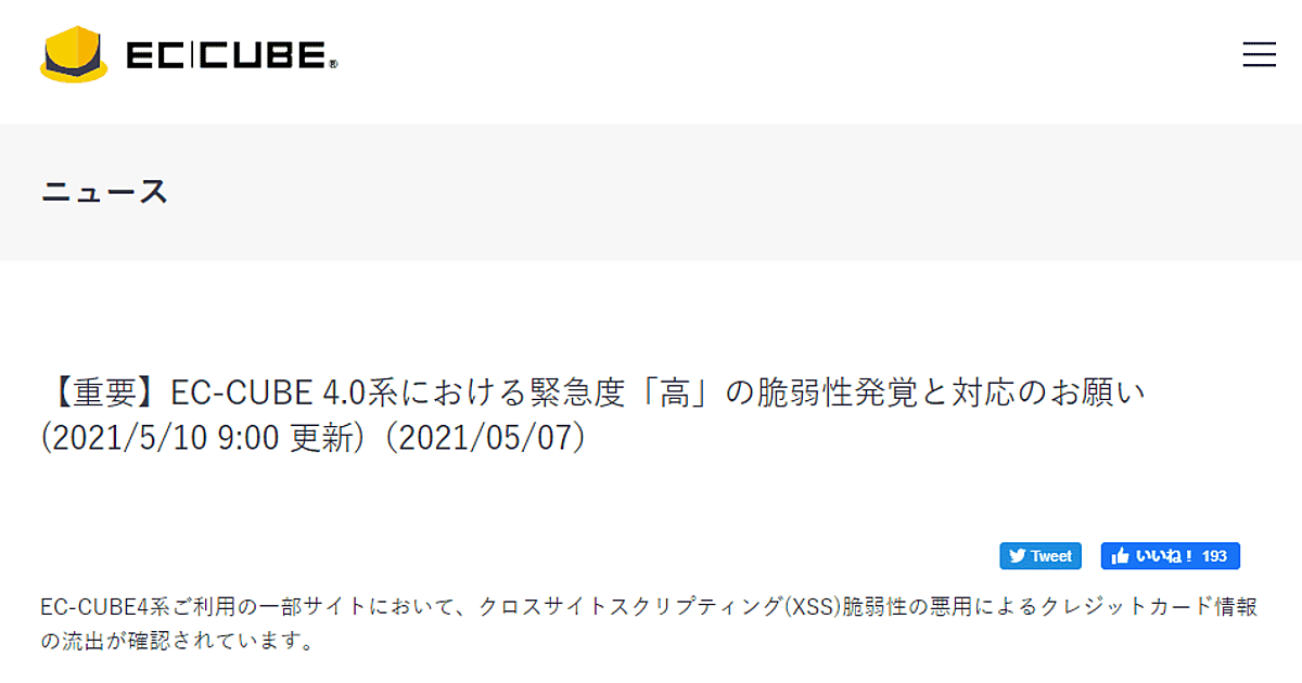 なお、クラウド版「ec-cube.co」は5月7日時点でHotfixパッチの適用を完了。新たにEC-CUBEをダウンロードされる場合については、Hotfixパッチを適用した最新版の「EC-CUBE 4.0.5-p1」を5月10日にリリースした。