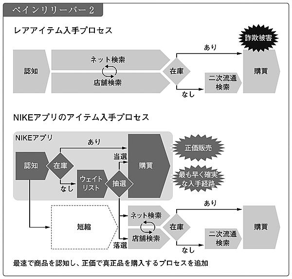 もう1つは、NIKE SNKRSなどの直販アプリによって、メーカー直販という「入手手段の価値」を消費者に提供したことです。こだわりのない消費者は売られている商品の中から最善のものを選びますが、熱心なファンは欲しい商品をどうしても手に入れたいと考えます。その商品が量販店やAmazonで欠品すると、公式店舗や大型量販店がない地方在住者などは、人気商品が入手困難であるというペインに悩まされます。さらには、転売業者によって価格が高騰したり、二次流通による詐欺被害にあったりという新しいペインも生み出されるかもしれません。