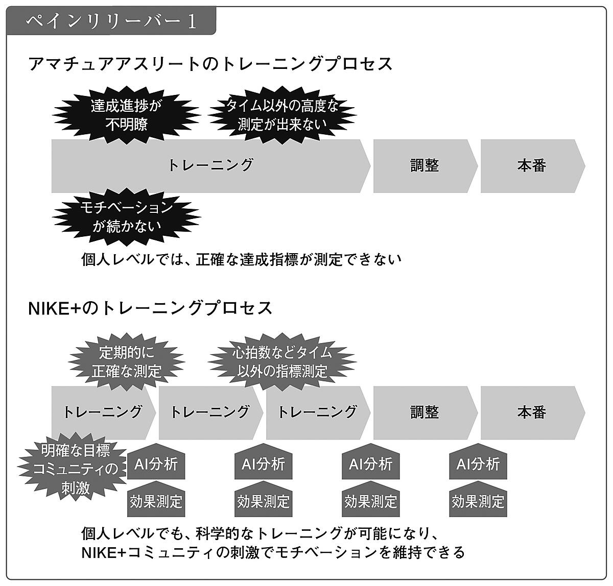 そのNIKEが大きくプロセス変革をしたのは、2006年のNIKE+から始まったデジタルシフトです。NIKE+はデータ測定をトレーニングに持ち込むことで、2つのペイン除去に貢献しています。