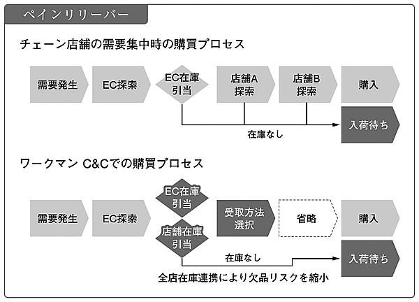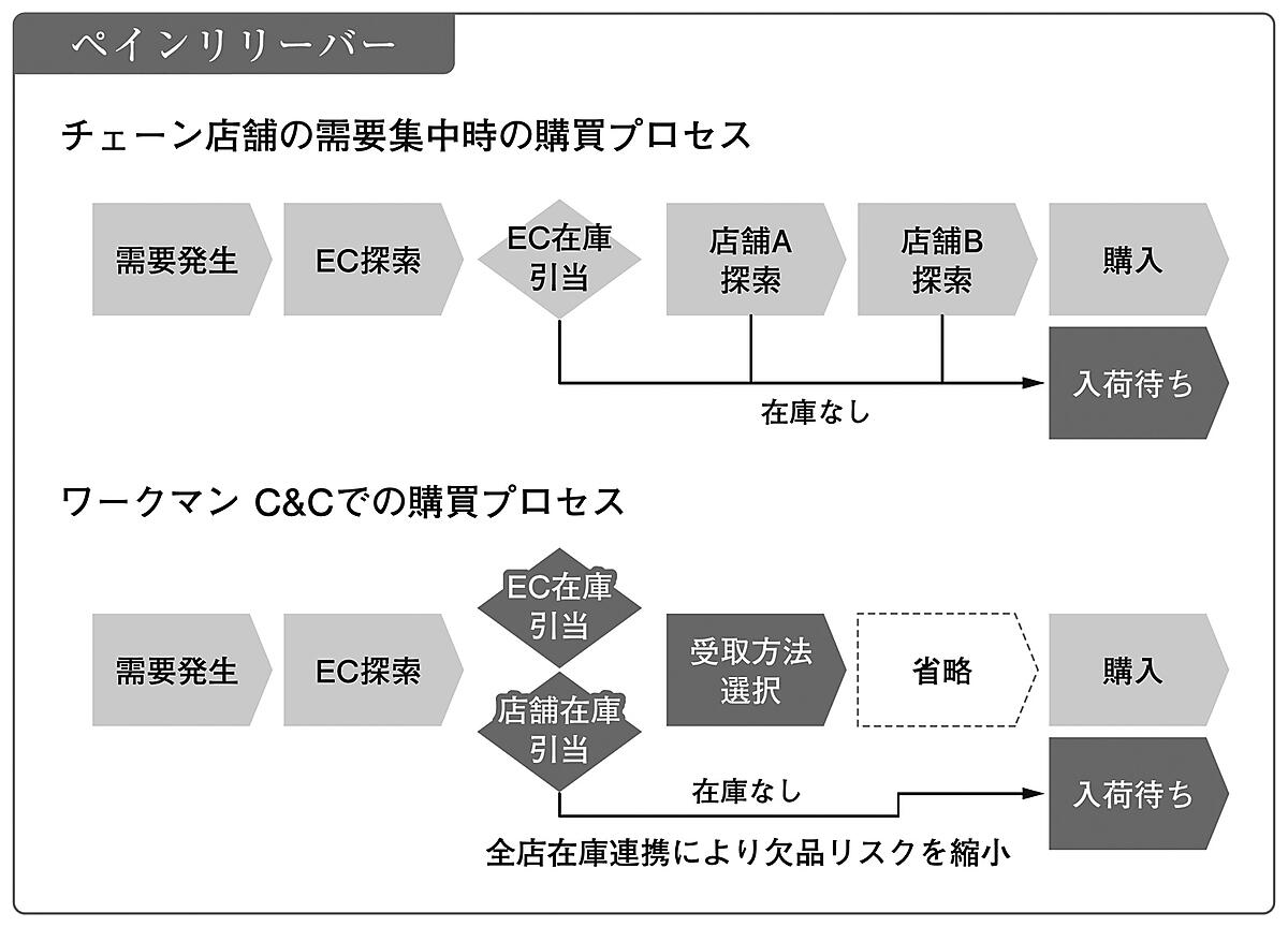 このような状況において自社流通網を持つことはチェーンストアの本領発揮ですが、ECが独立店舗として在庫情報を閉じていると、その優位性を発揮しきれません。ワークマンのように在庫が全店舗統合されれば、欠品リスクは最小化され、供給力は格段に跳ね上がります。ワークマンのリアルとデジタルの在庫統合(仮想倉庫形成)によって、緊急時の欠品や調達困難というペインを取り除くことができるのです。