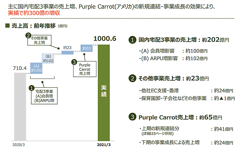 国内宅配事業の会員数増加の効果により約200億円の増収。さらに、新型コロナウイルスの影響による1ユーザーあたりの売上増の効果などで合計約300億円の増収効果があったと分析している。