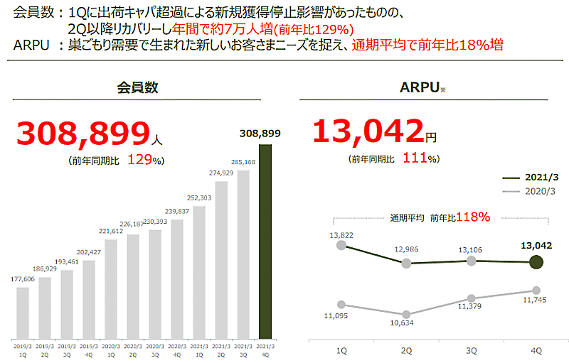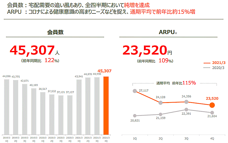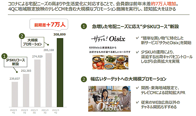 「Oisix」の売上高は前期比39.2%増の498億6300万円、セグメント利益は同87.1%増の89億8400万円。第1四半期に、急激な需要増に起因する物流センターの出荷キャパシティー逼迫で新規会員獲得を停止したものの、第4四半期にはテレビCMなど新規会員獲得のプロモーション施策を行い、会員数は2020年3月末の23万9837人から、2021年3月末には30万8889人へと増加した。