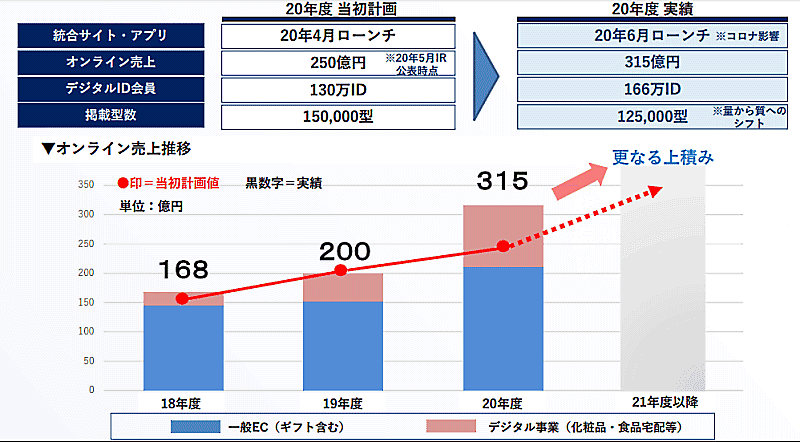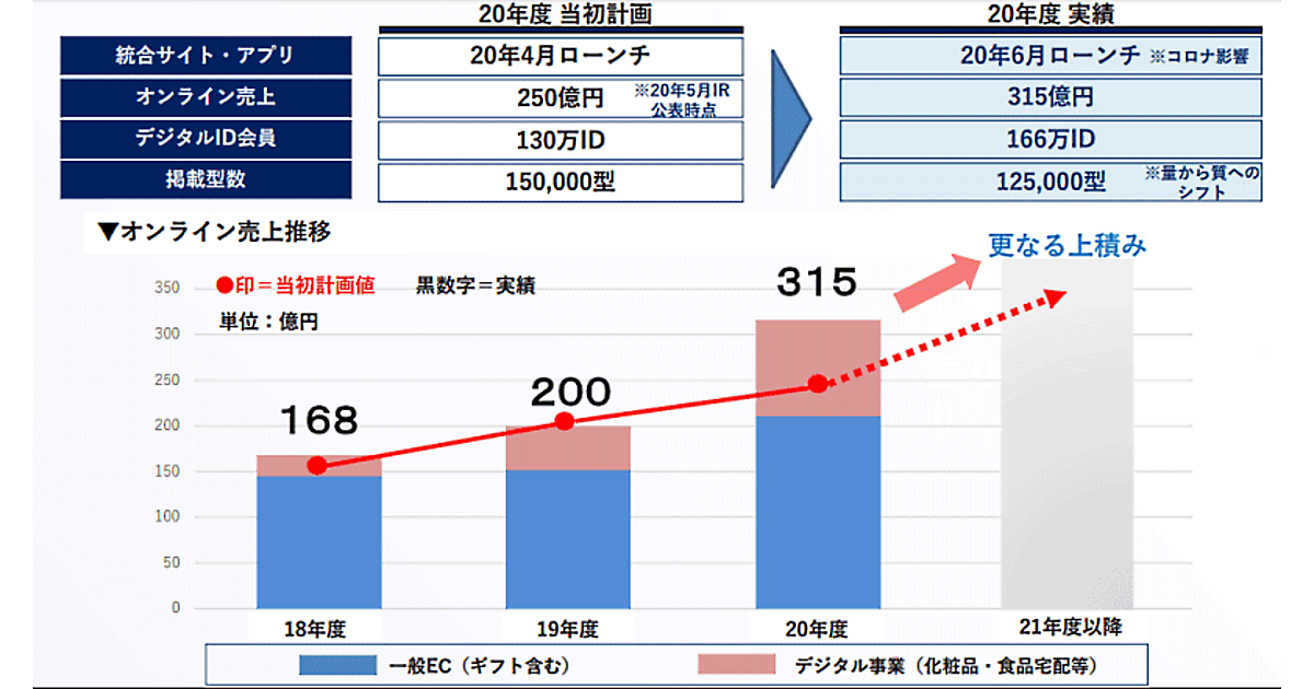 デジタル事業は、化粧品ECサイト「meeco(ミーコ)」や食品定期宅配サービス「ISETAN DOOR(イセタンドア)」を展開。EC売上高は当初250億円を計画していた。2021年3月期のEC事業売上高は当初計画比26.0%増。