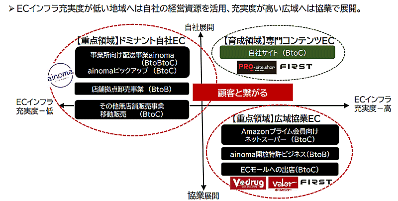 EC戦略として2つの重点領域を設定し、主要業態がドミナントを形成する地域では自社の経営資源を中心に展開する「ドミナント自社EC」、2021年夏からアマゾンジャパンと開始するネットスーパー事業のような自社で足りない技術やマーケットを協業などによって補完する「広域協業EC」に取り組む。