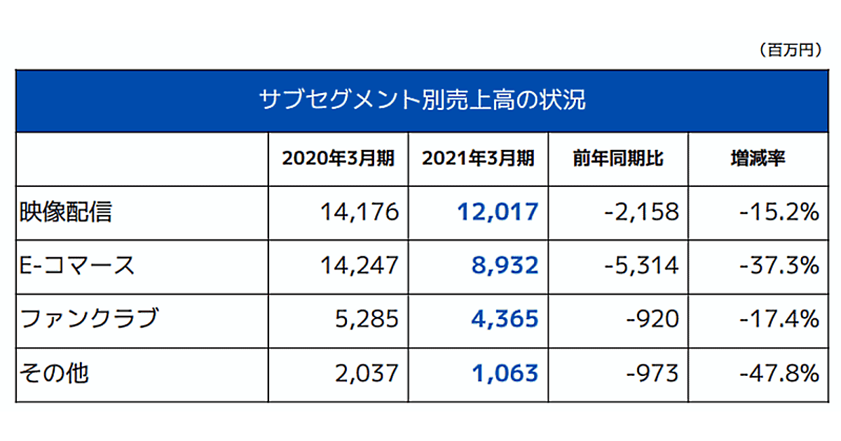 新型コロナウィルス感染症拡大で、観客を動員するライヴやイベントの中止、延期、規模縮小による開催が相次ぎ、ライヴ・イベントの積極的な開催が困難となったことが影響した。それに伴い、音楽コンテンツの企画・制作・販売を行う「音楽パッケージ」が減収し、ECにも響いた。DVDやブルーレイなどの販売落ち込みが影響した。