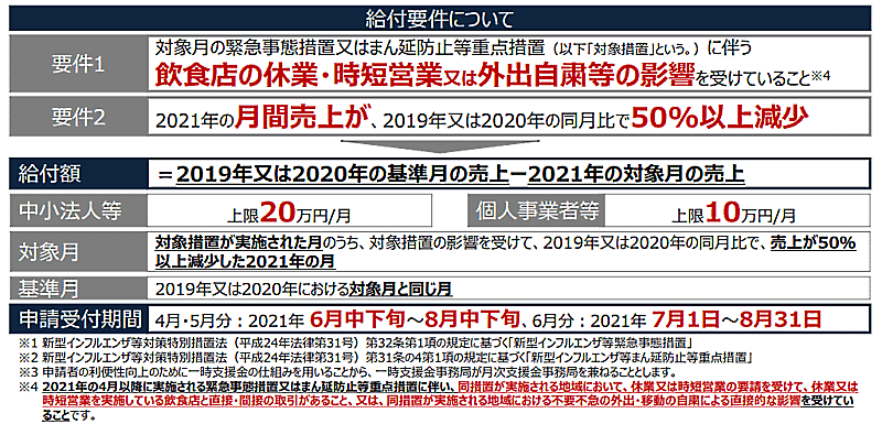 2021年の4月以降の対象月と、2019年または2020年の基準月と比べて月間売上が50%以上減少している中小企業や個人事業者で、1か月あたり、中小企業などの上限は20万円/月、個人事業者などは10万円/月。