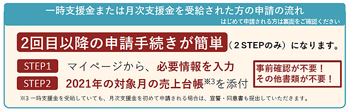 また、2回目以降の「月次支援金」受給(たとえば、4月分を受給し、5月分を受給申請する場合)をする場合も、提出資料を簡略化できるとしている。