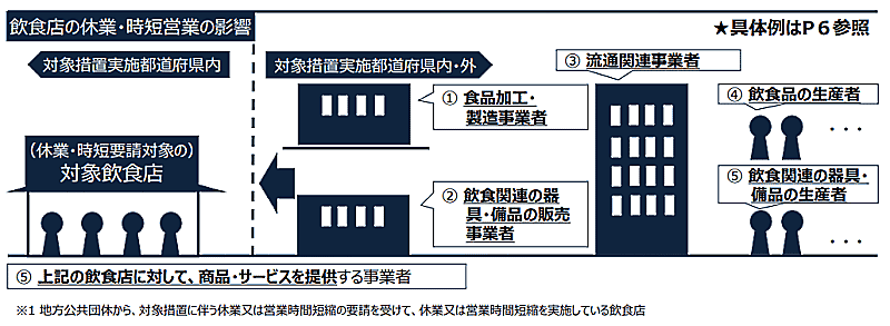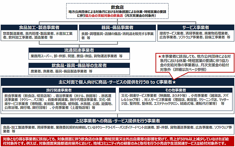 - 対象措置を実施する都道府県に所在する飲食店と直接・間接の取引があることによる影響を受け、2021年の月間売上が2019年または2020年の同月比で50%以上減少していること