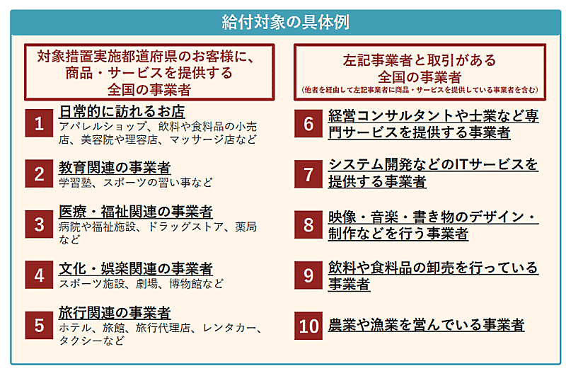 次の1または2の要件を満たす事業者は、業種や所在地を問わず給付対象となり得るという。