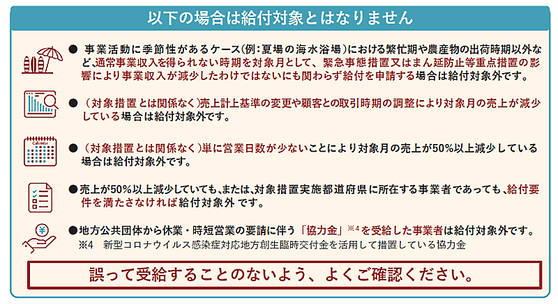 事業活動に季節性があるケース(夏場の海水浴場など)における繁忙期、農産物の出荷時期以外など、通常事業収入を得られない時期を対象月として給付を申請する場合は給付対象外。売上計上基準の変更、顧客との取引時期の調整による対象月の売上減少、単に営業日数が少ないことによる対象月の売上50%以上減の場合は、給付要件を満たさないとしている。
