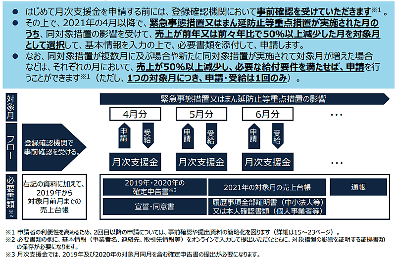 「月次支援金」の給付は2021年1月に発令された緊急事態宣言の影響緩和のための給付金制度「一時支援金」の仕組みを採用。事前確認や提出資料を簡略化し、申請者の利便性を高めるとしている。