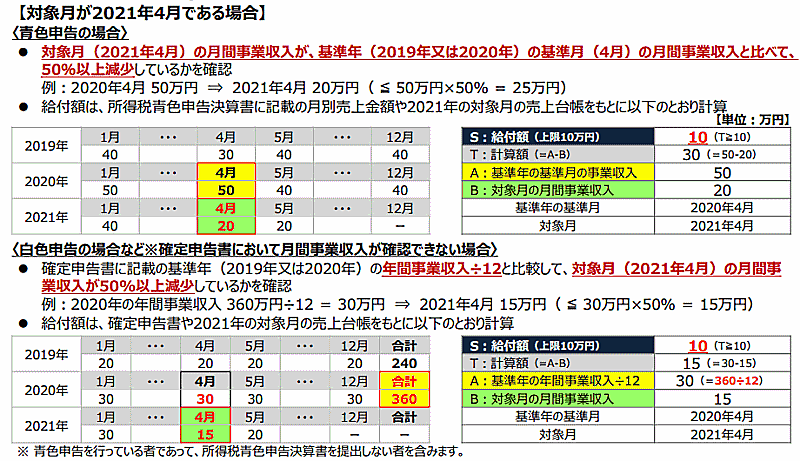2021年4月以降の対象月の売り上げと、2020年または2019年の基準月の売り上げの差額分が給付額になる(上限がある)。