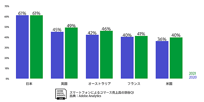 日本の2021年1-3月期における売上高の61%はスマートフォン経由での購入。イギリス、オーストラリア、フランス、米国を含む他国の結果と比べると、日本が最も高いという。