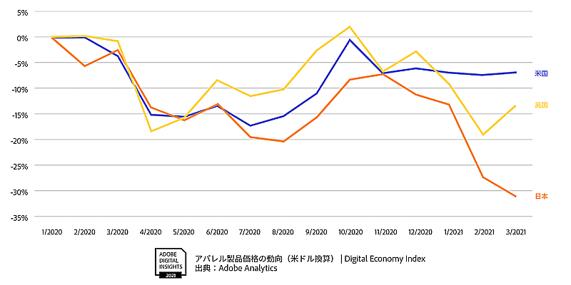アドビの分析アプリケーション「Adobe Analytics」によって計測されるECなどのデジタル取引状況を活用したデジタル経済指標「Adobe Digital Economy Index(DEI)」を基に分析。DEIの測定に合わせて行った補完調査は、米国、英国、日本の3か国でそれぞれ18歳以上の消費者1000人を対象に2021年2月26日~2021年3月2日、2021年3月24日~2021年3月29日に実施した。
