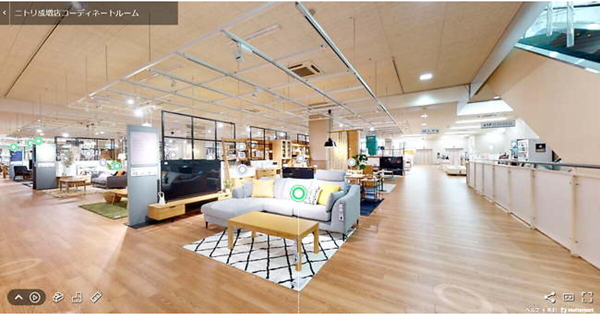 「ニトリバーチャルショールーム」は、実際のニトリの店内にあるコーディネートルームを3D撮影しバーチャルルーム化。店内を360度見渡しながらショールーム内を移動し、好みのコーディネートを探すことができる。