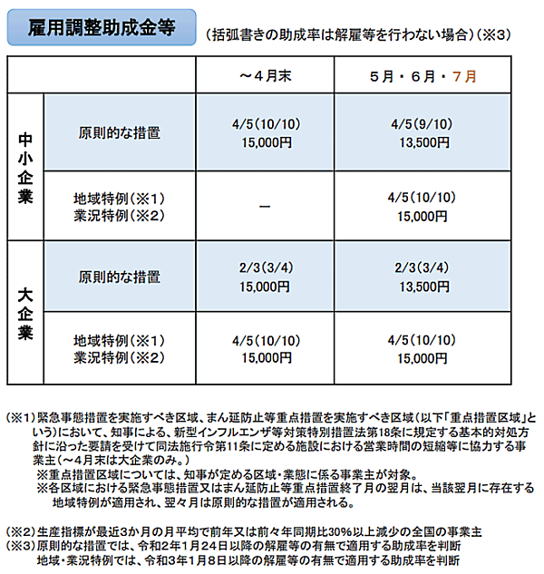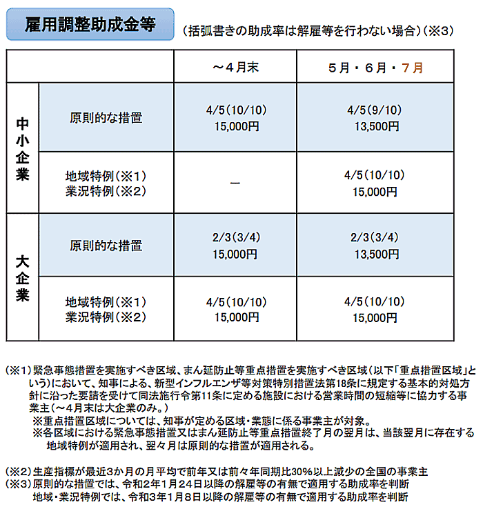 緊急事態宣言の延長などを踏まえ、7月も5-6月の助成内容を継続。8月以降の助成内容は、雇用情勢を踏まえながら検討、6月中に公表するとしている。