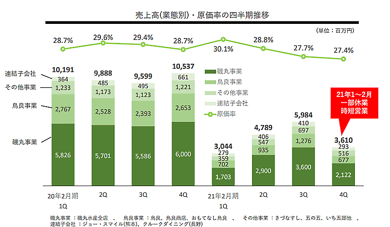 SFPホールディングスの2021年2月期連結決算は売上高が前期比56.7%減の174億2800万円で、当期純損失は56億5000万円。本業となる居酒屋展開の磯丸事業部門では、「磯丸水産」を17店舗退店、2月末の店舗数は直営106店舗、フランチャイズは13店舗となった。磯丸事業部門の売上高は同55.3%減の103億2600万円。