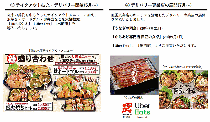 丼物を中心としたテイクアウトメニューに加え、浜焼き・オードブル・弁当などを大幅に拡充。2020年7月にはデリバリー専業店もスタートし、「うなぎの岡島」「からあげ専門店 巨匠の食卓」といったブランドでもデリバリー展開を始めている。