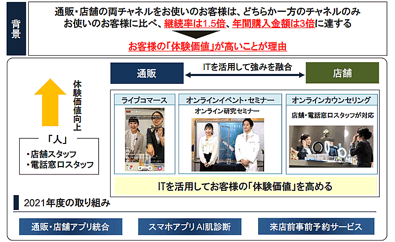 2021年度は、通販・店舗アプリの統合、スマホアプリによるAI(人工知能)を使った肌診断、来店前事前予約サービスなどの実現を予定している。
